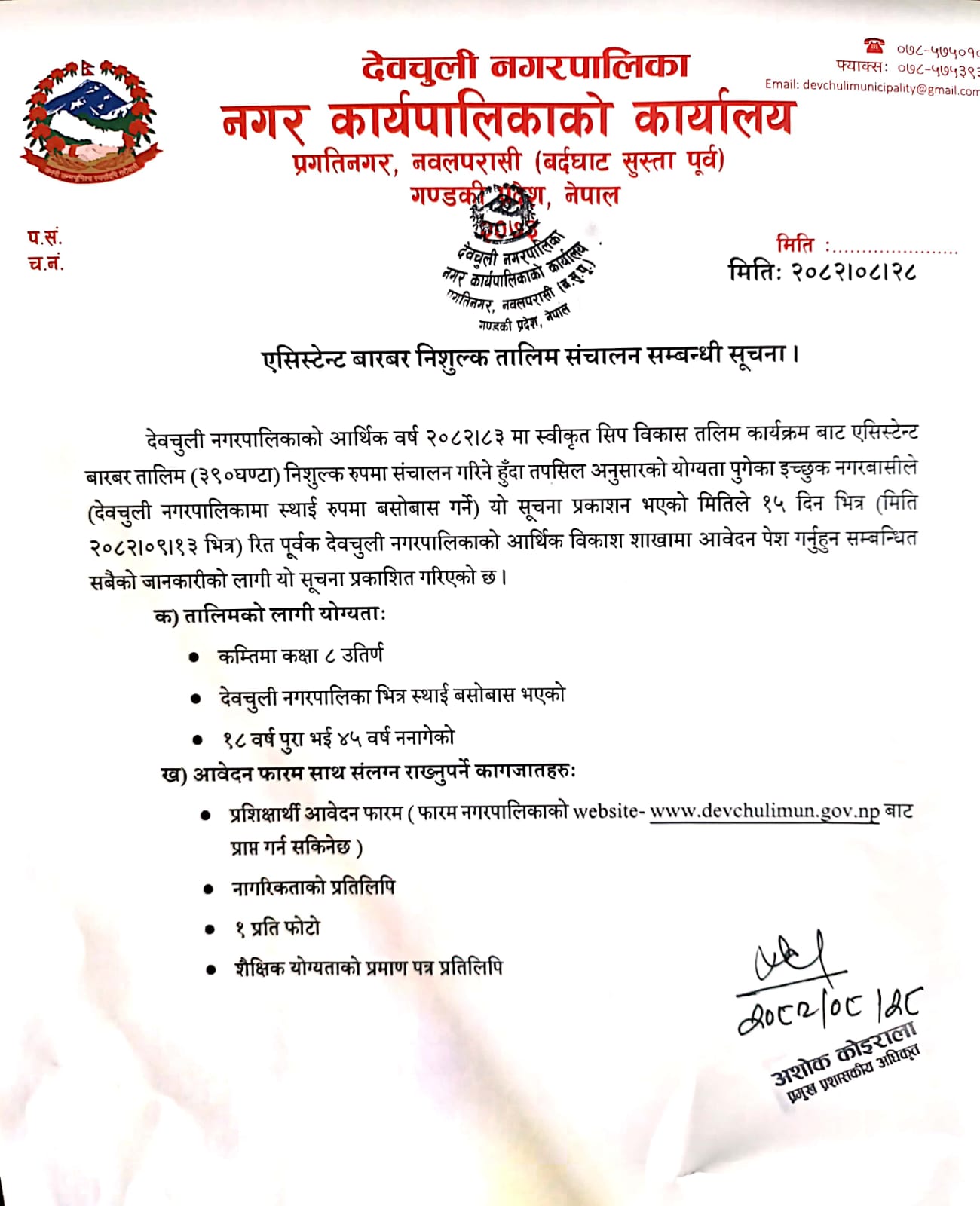 एसिस्टेन्ट बारबर नि शुल्क तालिम स‌चालन सम्बन्धी सूचना ।