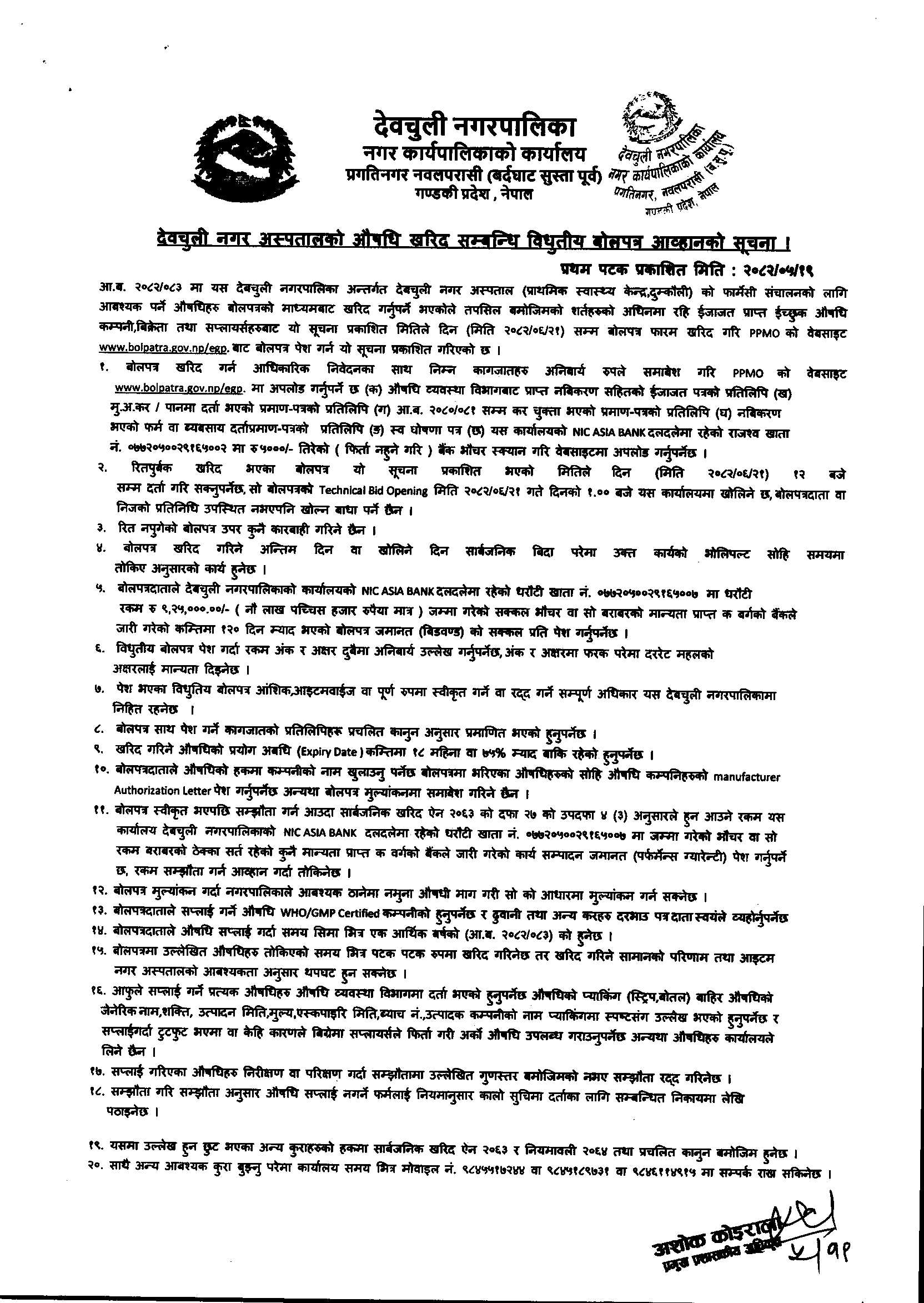 देवचुली नगर अस्पतालकाे ‌अ‍ाैषधि खरिद सम्बन्धि विधुतिय बाेलपत्र आव्हानकाे सूचना ।