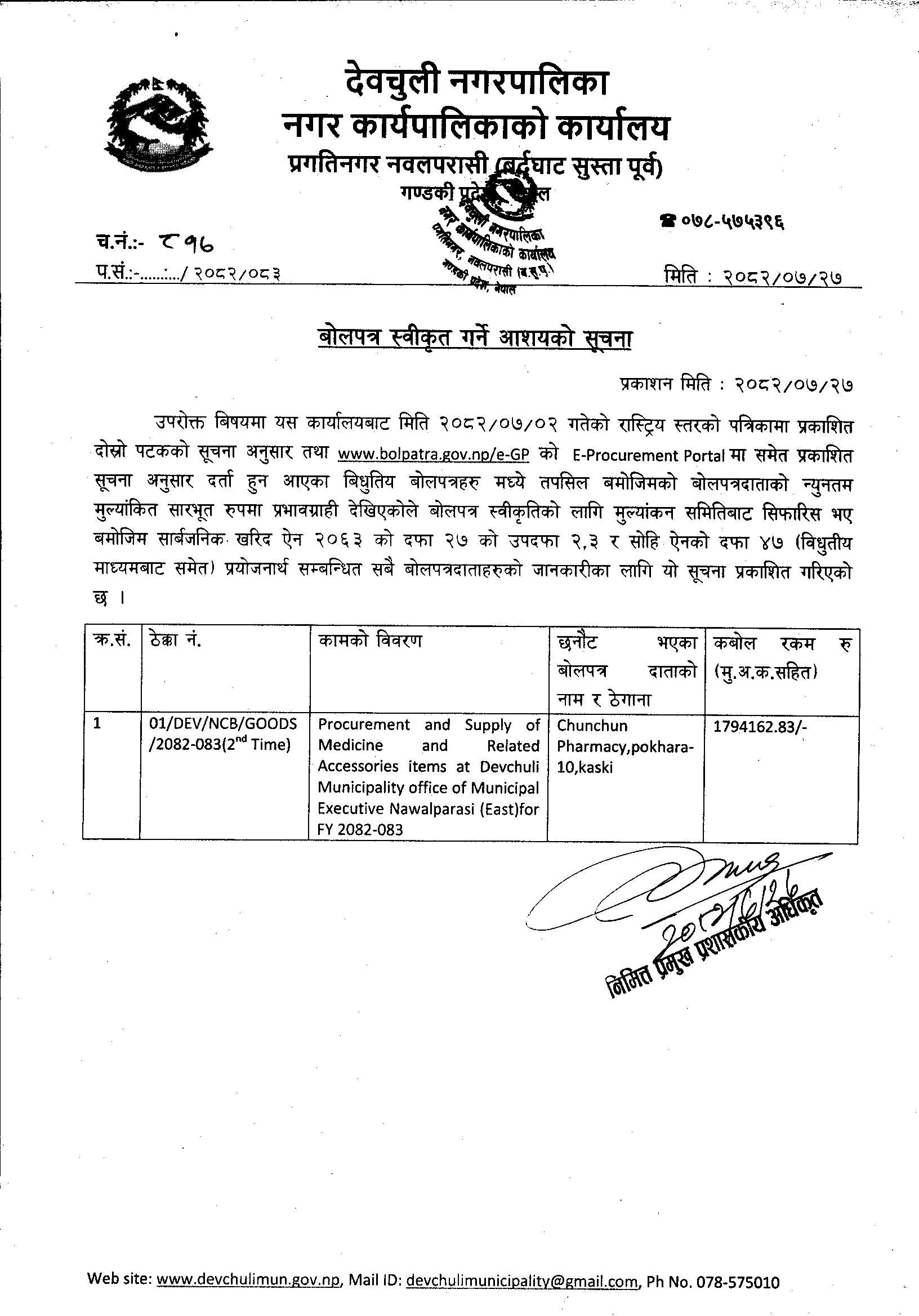 बाेलपत्र स्वीकृत गर्ने आश्यकाे सूचना ।
