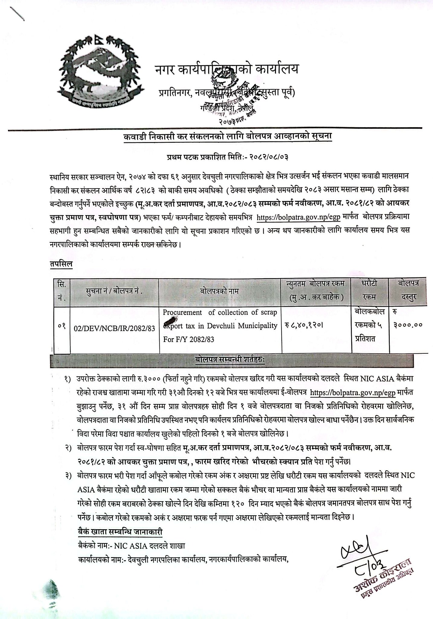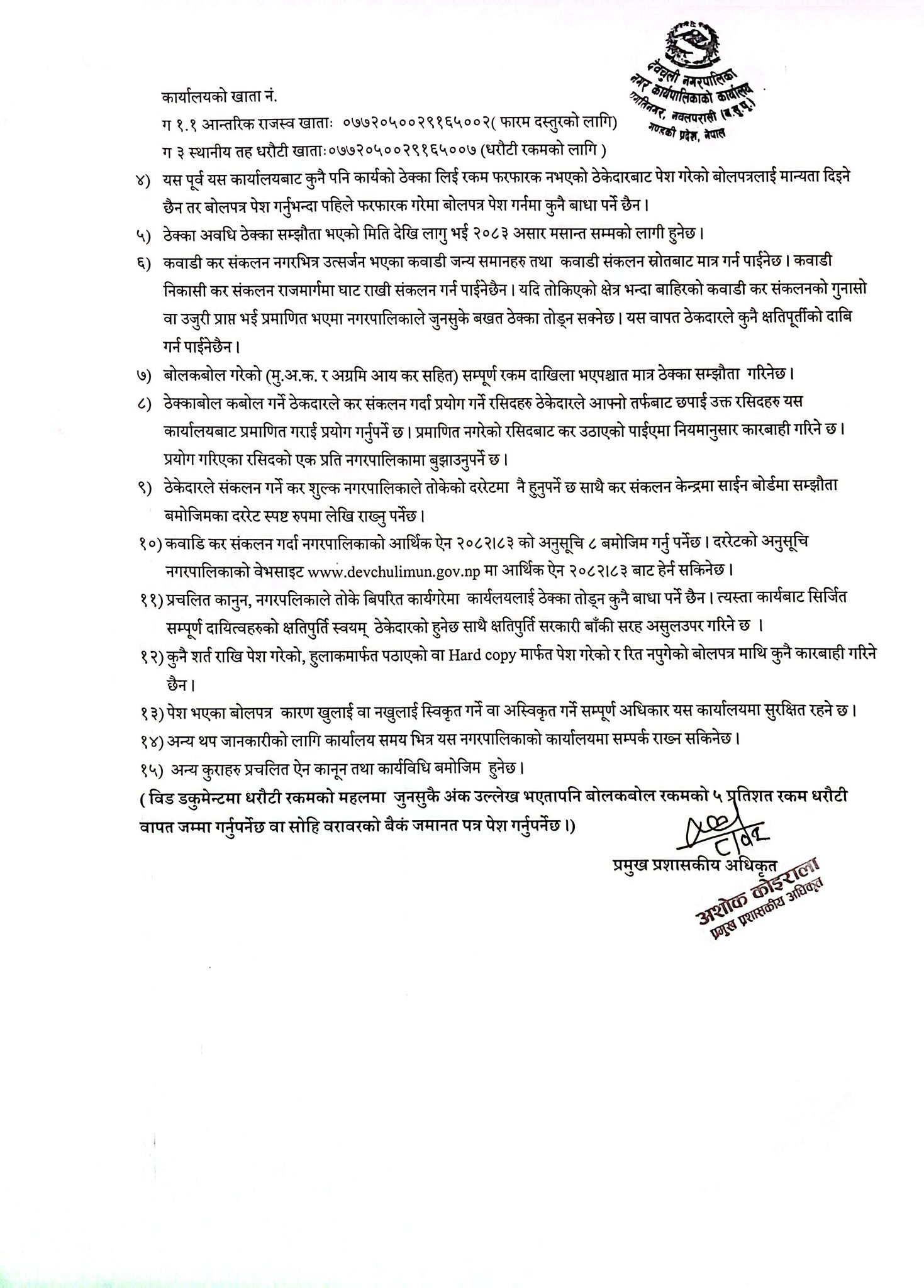कवाडी निकास कर सङ्कलनको लागि बोलपत्र आह्वानको सूचना ।