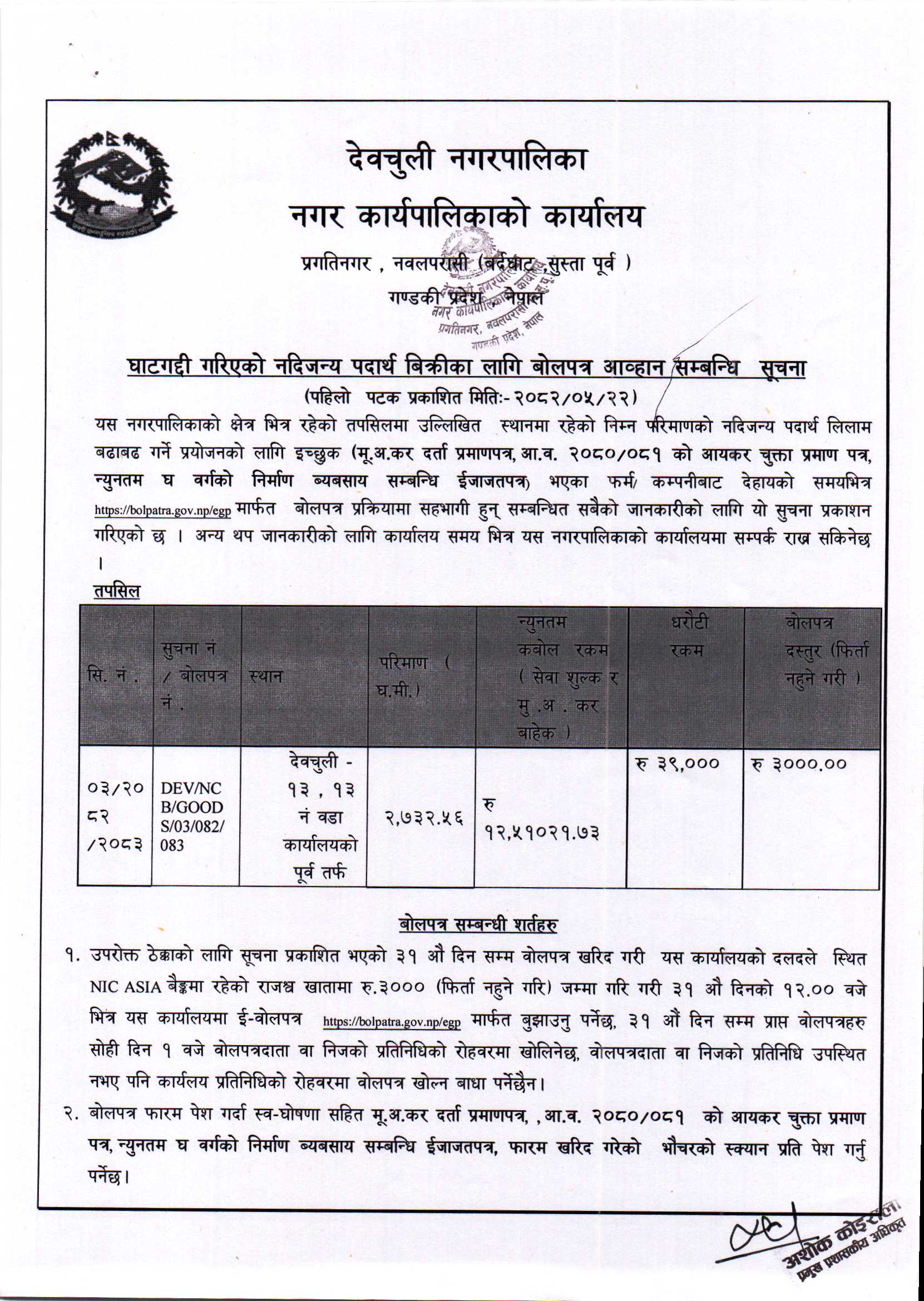 घाटगदी गरिएकाे नदिजन्य पदार्थ विक्रिका लागि बाेलपत्र आव्हान सम्बन्धी सूचना ।