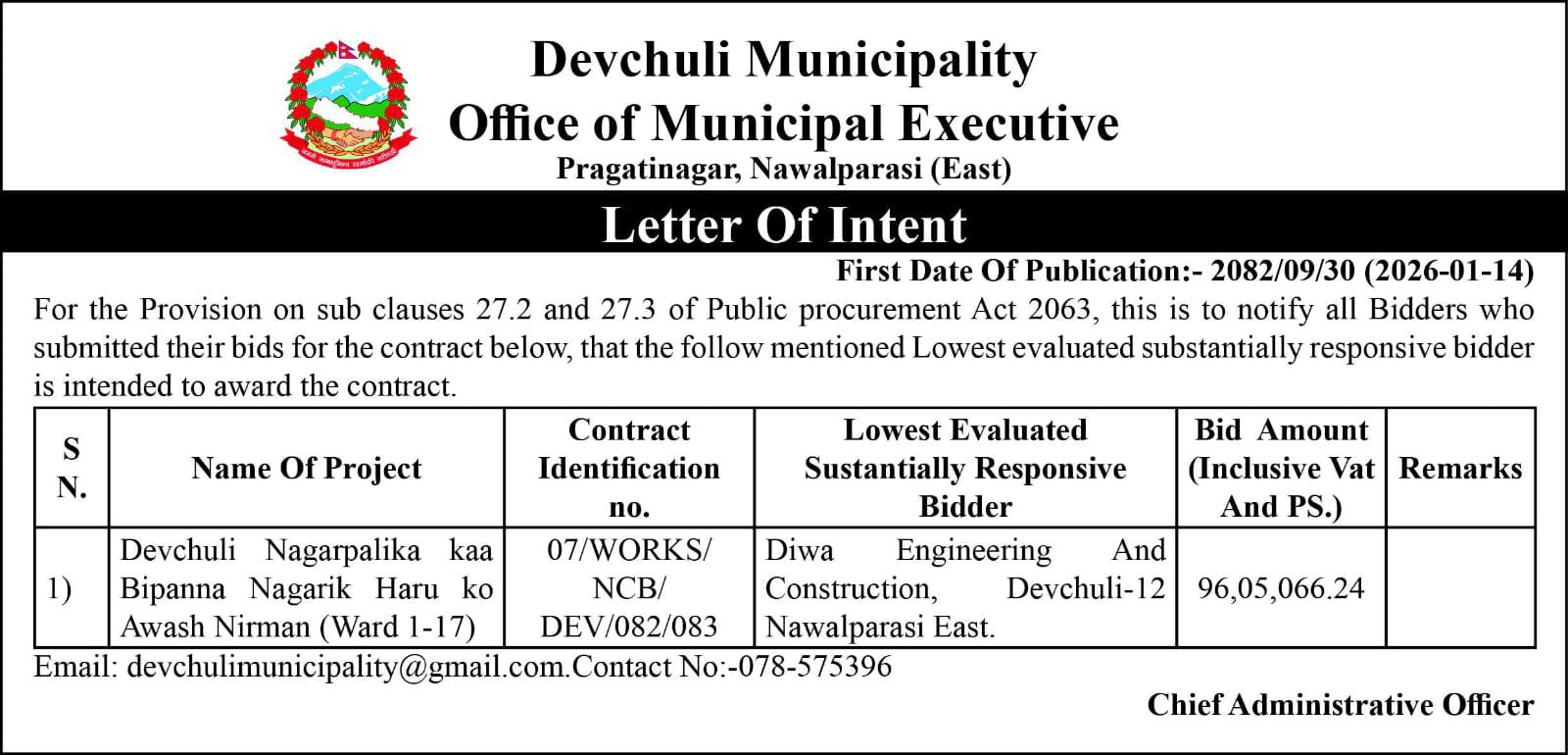 बाेलपत्र स्वीकृत आशयकाे सूचना ।