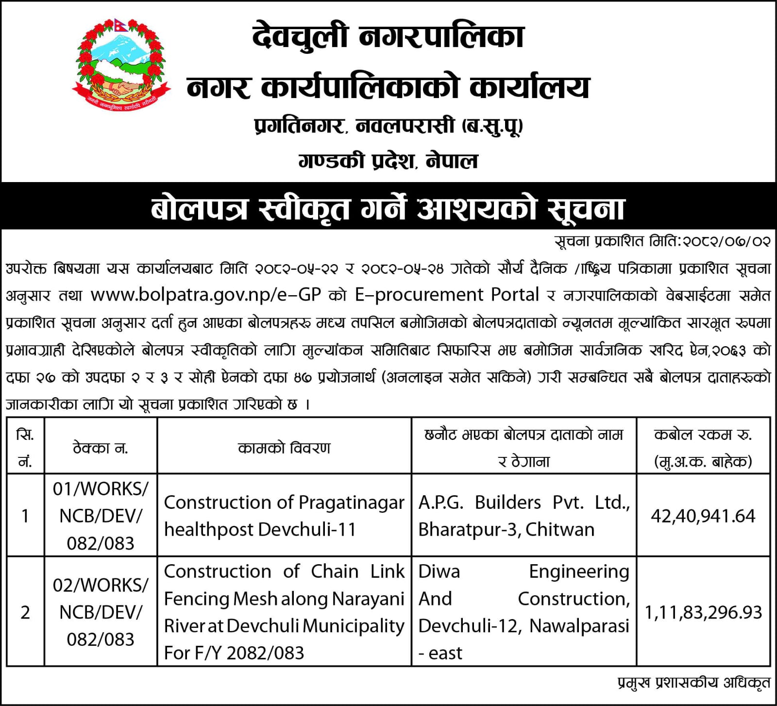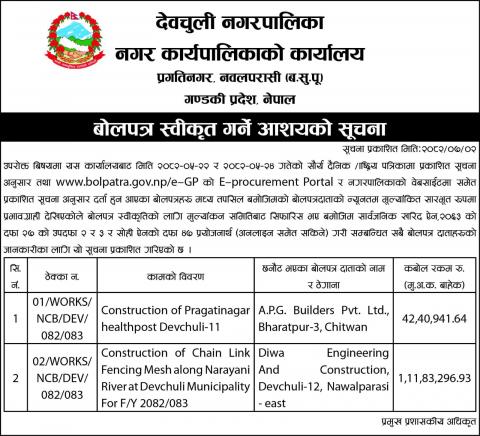 बाेलपत्र स्वीकृत आश्यकाे सूचना ।