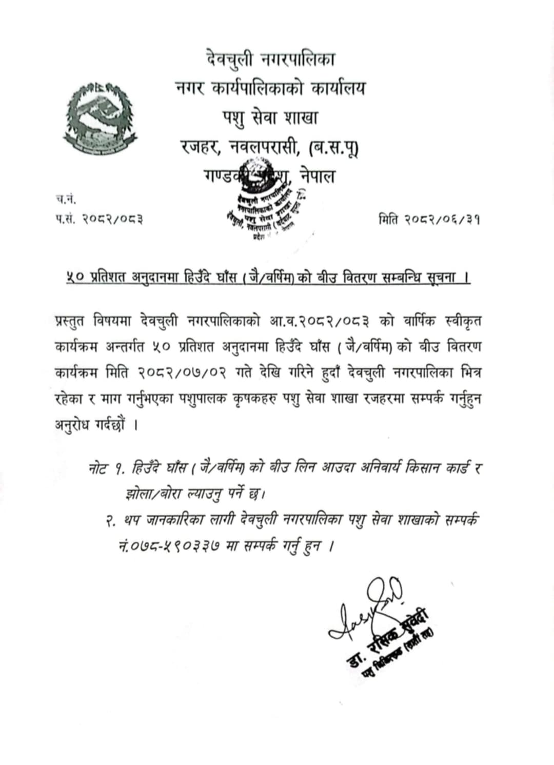 ५० प्रतिशत अनुदानमा हिउँदे घाँस बिऊ वितरण सम्बन्धि सूचना ।